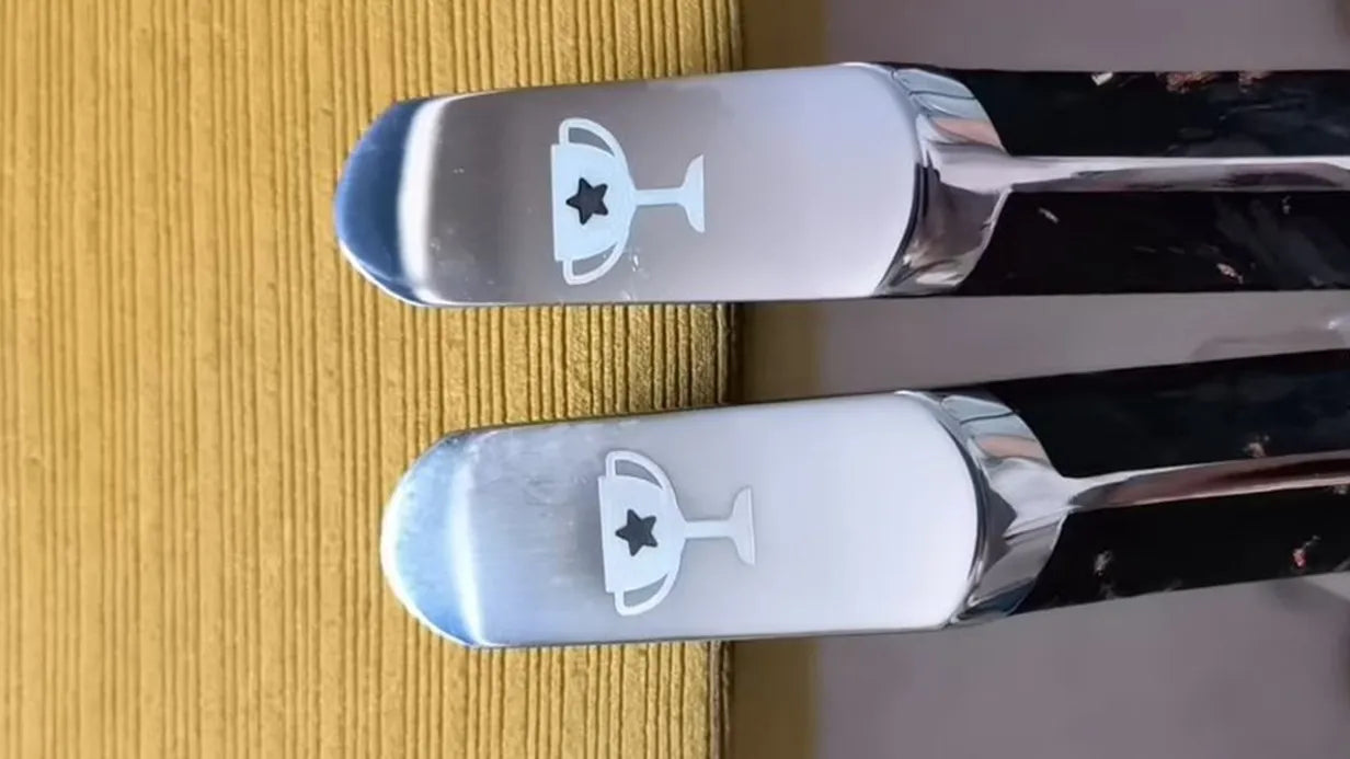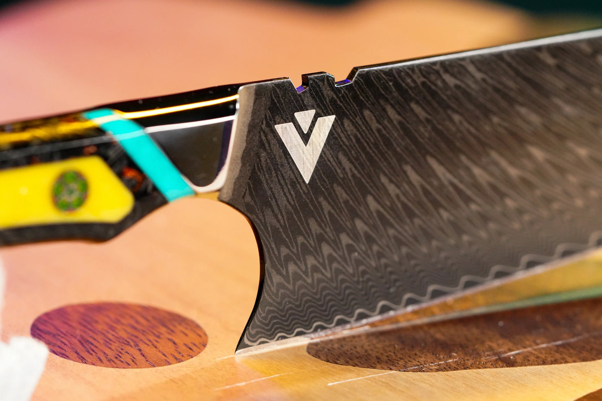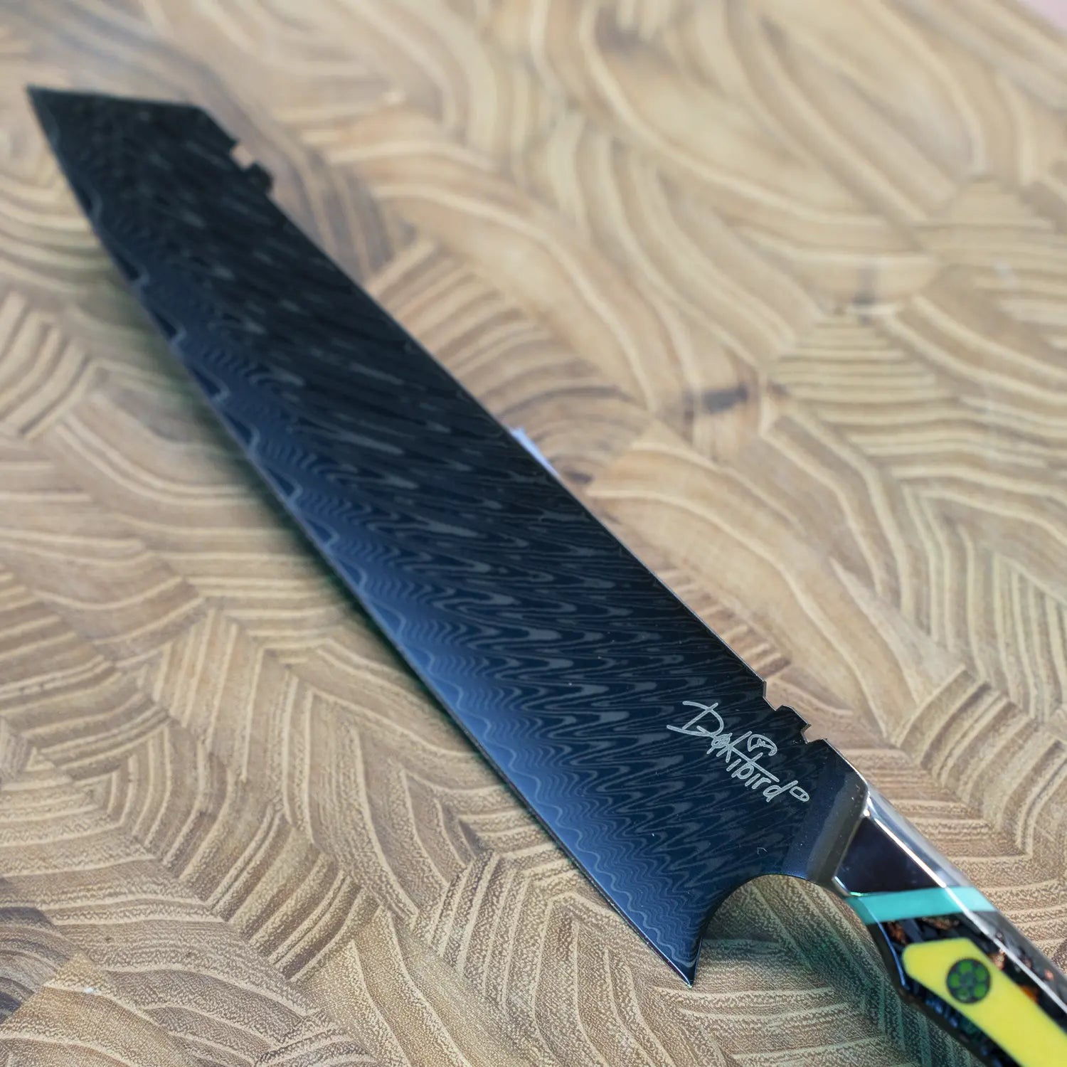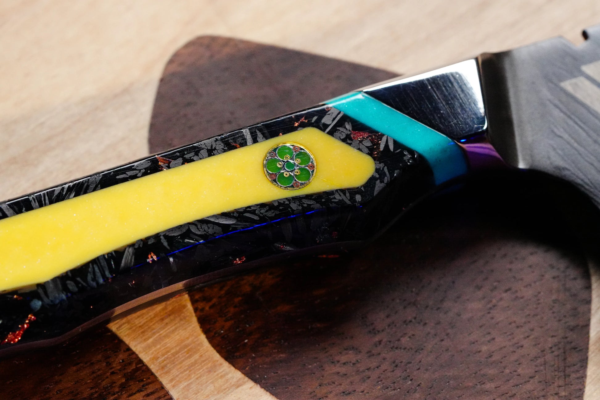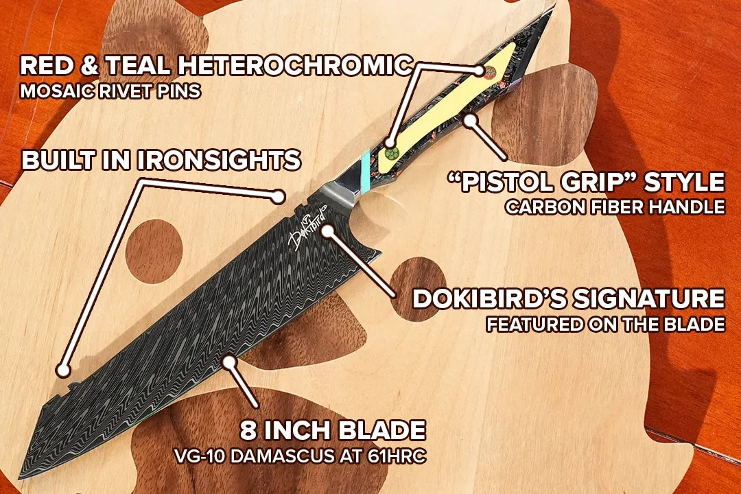This hand finished Japanese bunka style knife features a premium 67-layer VG10 Acid Etched Blackened Damascus steel vacuum hardened to 61HRC for an incredibly long lasting knife edge. Each full tang knife is built with shredded carbon fiber scales containing golden foil, with Dokibird's signature etched into the blade and her oshi mark in the butt plate. The red and teal mosaic rivet pins reflect her distinctive heterochromia when she’s locked in, while the ironsights help with... sharpshooting.