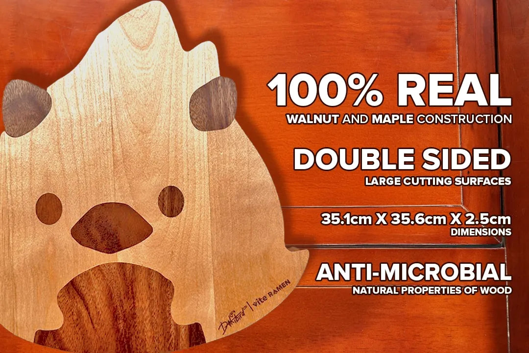 A hand finished premium maple and walnut cutting board created in collaboration with Dokibird, made to look like the cutest chonky dragoon, and just as thick as a chonky dragoon too! Natural wood construction offers microbial resistant properties when taken care of, and won't dull knife edges like bamboo or glass surfaces.