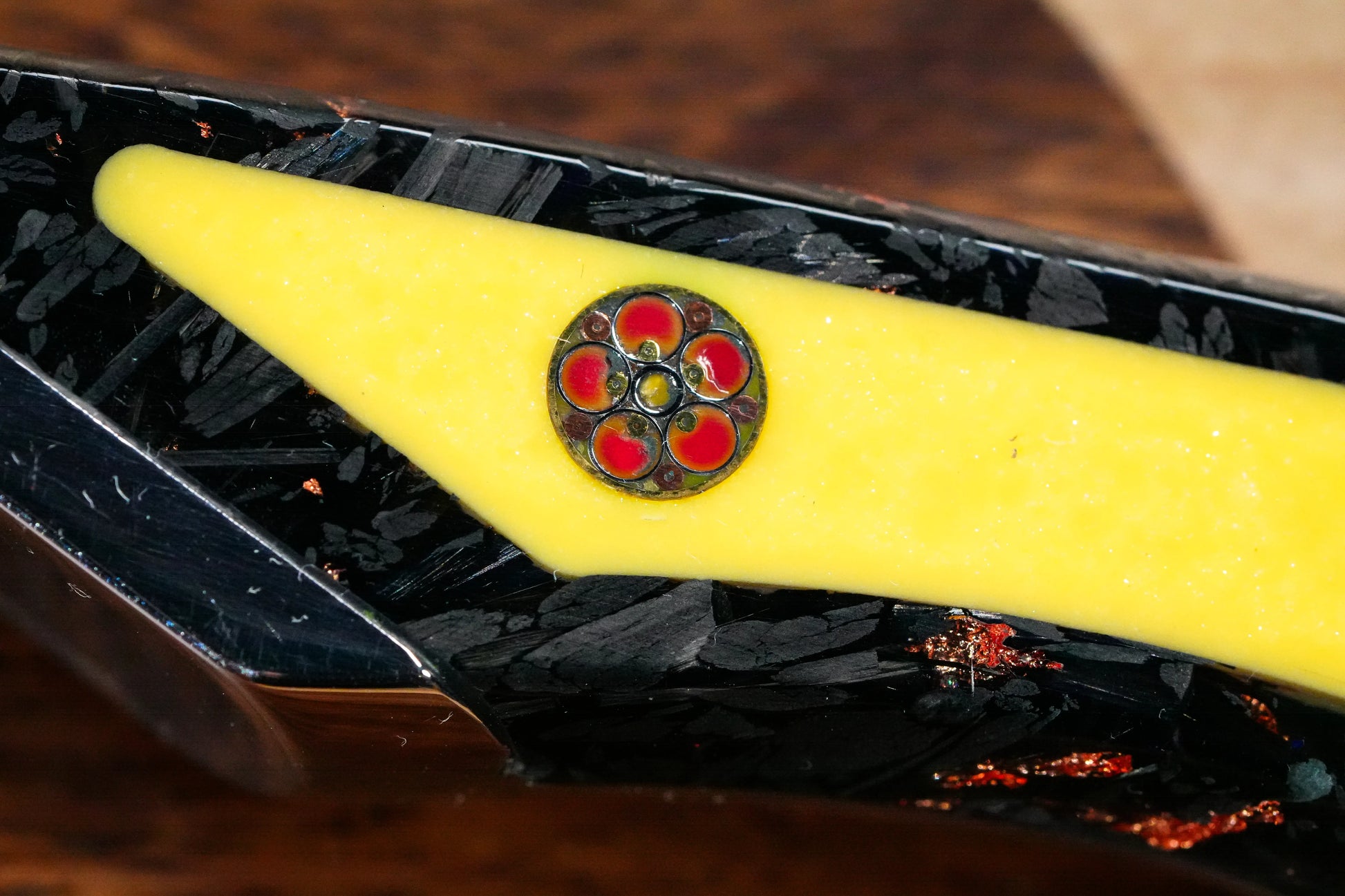 Featuring 67-layer Damascus steel construction with Dokibird's signature etched into the blade. The handle is built with shredded carbon fiber scales containing golden foil, along with red and teal mosaic rivet pins reflect her distinctive heterochromia when she’s locked in.