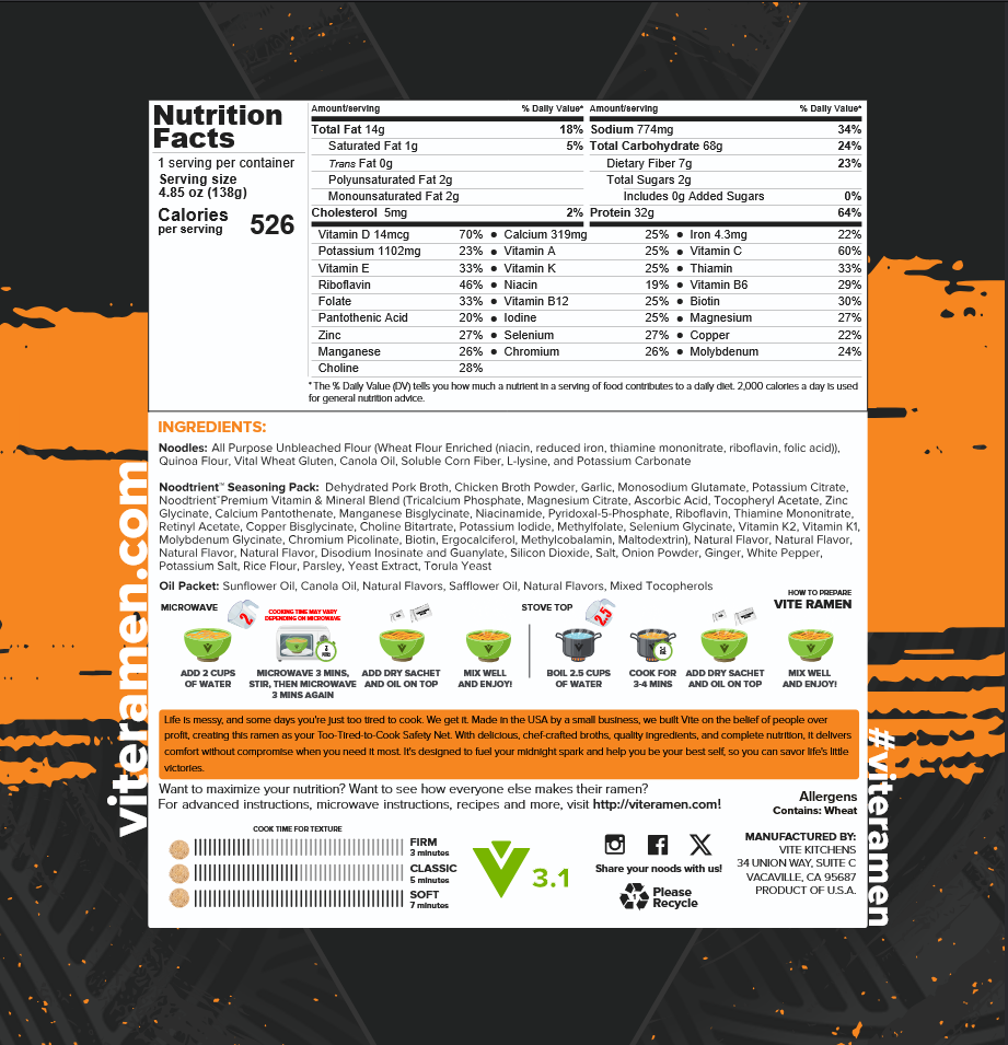 Noodtrient™ Seasoning Pack: All Purpose Unbleached Flour (Wheat Flour Enriched (niacin, reduced iron, thiamine mononitrate, riboflavin, folic acid), Quinoa Flour Vital Wheat Gluten, Canola Oil, Soluble Corn Fiber, L-lysine, and Potassium Carbonate.