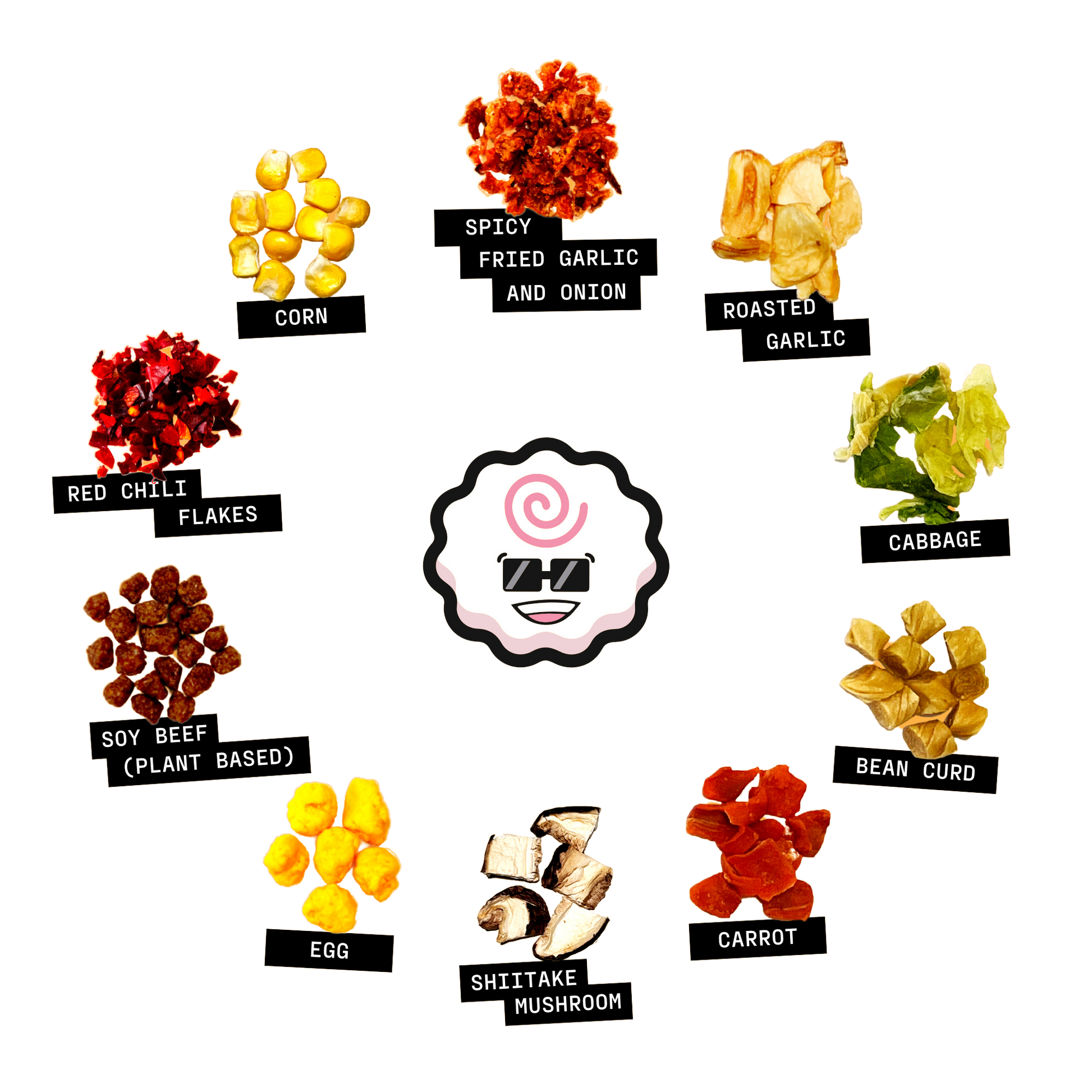 Toppings: Cabbage, Roasted Garlic, Egg, Carrot, Soy beef, Fried Spicy garlic and Onion, Shiitake Mushroom, Red Chili, Bean Curd.